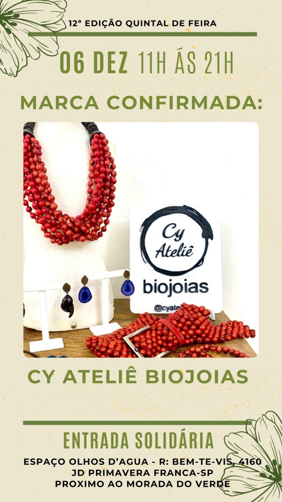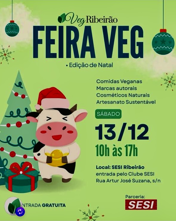 Encontro mensal de produtos voltados ao público vegano, em Ribeirão Preto, que sempre tem também música ao vivo e outras atrações. Estaremos lá nesta edição de Natal, com nossas biojoias, veganas e orgânicas! Clique aqui para saber mais.